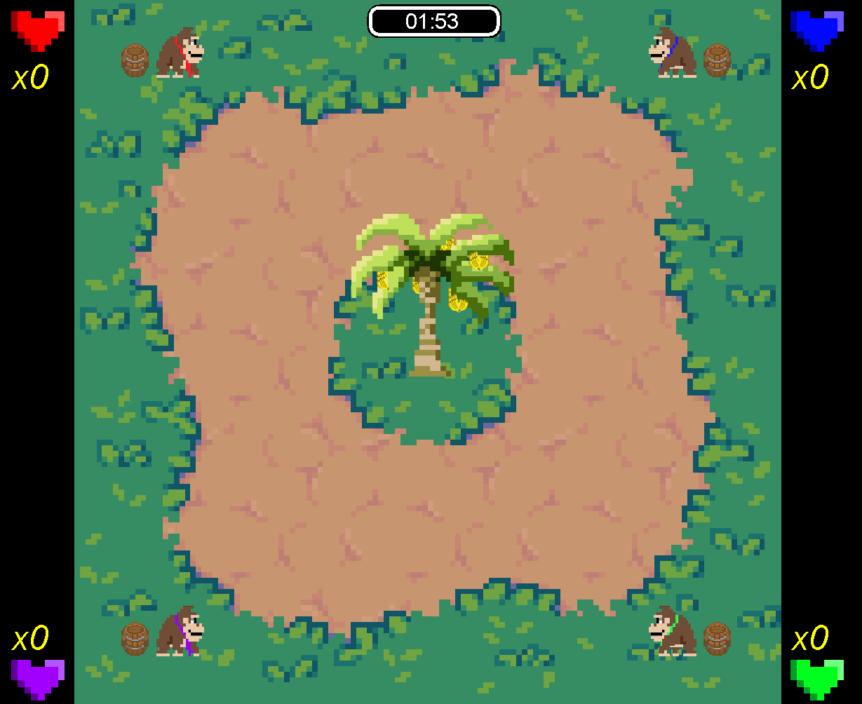 For this project, it was completed as a group of four for our final project/assignment in my AP Computer Science A class. We made this program entirely through the IDE Visual Studio Code in Java, which was the main focus of the class—learning the basics of Java and gaining experience and proficiency in it. The game is multiplayer, allowing up to four players at a time, each controlling their own avatar. The goal is to have the most bananas at the end of the timer. The game is playable only locally, fitting all four controls for each avatar on one keyboard. These controls consist of movement in all four directions (up, down, left, right) and an additional control to punch for collecting bananas, depositing them, and punching other players to eliminate them or hit their barrels to steal deposited bananas.